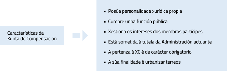 Neste sentido, a XC presenta unhas particularidades de seu, xa que se constitúe como unha entidade urbanística colaboradora con personalidade xurídica propia e con capacidade plena na toma de decisións que considere pertinentes, tendo como obxectivo principal controlar e dirixir o proceso de urbanización, que agrupa todos os axentes que participan neste sistema, e non perseguindo en ningún caso fins lucrativos. Ademais, xestionan intereses estritamente privados dos seus membros, pero que están sometidos á tutela dunha Administración pública, a cal lle outorga o exercicio dunha serie de potestades administrativas para a consecución das súas actividades na medida necesaria para garantir os intereses públicos, mostrando o gráfico 1 as principais características da XC.