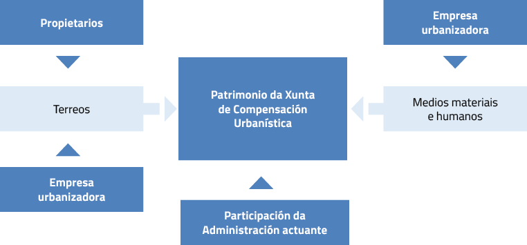 Neste sistema participan diferentes axentes económicos, sendo o máis importante a XC, que adquire personalidade xurídica propia, como ente dependente da Administración actuante, tras a súa inscrición no Rexistro de Entidades Urbanísticas Colaboradoras. A súa finalidade principal é cumprir cos fins e obxectivos para os que é constituída, definidos nos estatutos e nas bases de actuación, e ten como órgano garante das súas actuacións a Administración actuante.