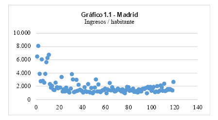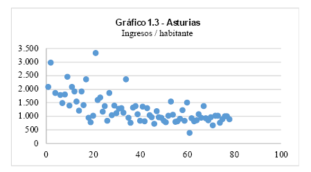 24 No gráfico 1.8 suprimíronse os datos de dous concellos, porque ao seren moi elevados distorsionan o conxunto do gráfico. Trátase, en primeiro lugar, do Concello de Valdelagua del Cerro (Soria), que no orzamento inclúe un ingreso de 424.000 € en concepto de investimentos de capital. Tamén se omitiu do gráfico 1.8 o Concello de Suellacabras, que orza 145.900 € de ingresos patrimoniais, o que dividido entre os seus 25 veciños presenta unha cifra de ingresos orzados por habitante non encadrable no gráfico.