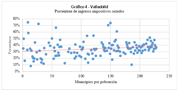 27. No que segue púxose atención só nos dous grupos de ingresos máis relevantes cuantitativamente, os ingresos impositivos propios e as transferencias doutras administracións públicas, que suman de media o 82 por 100 dos ingresos municipais40. Deixáronse fóra as taxas e os prezos, pola súa moderada relevancia cuantitativa41 e pola súa difícil identificación contable, ligada á forma de xestión de cada servizo municipal. En xeral, obsérvase unha gran diversidade na porcentaxe de ingresos impositivos, fundamentalmente nos concellos moi pequenos. Así se observa de forma exemplar no gráfico 4, referido aos ingresos impositivos orzados nos concellos de Valladolid. Nos concellos moi pequenos, que son a gran maioría na provincia, a diversidade de fontes de ingresos é elevadísima, indo desde o 75 % ao 10 % de ingresos orzados por ingresos municipais. Entre os concellos pequenos e medianos as diferenzas redúcense, oscilando entre o 30 % e o 40 %. Neste punto cómpre insistir de novo en que para os concellos moi pequenos un só concepto de ingreso moi relevante (como unha transferencia de capital elevada) afecta decisivamente á composición de todo o orzamento (supra § 9).