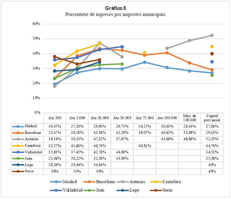 29. Tamén se observa que na maioría das provincias (as excepcións son Asturias, Lugo e Soria) os concellos de entre 5.001 e 20.000 habitantes son os que orzan máis ingresos impositivos. E, correlativamente, son os que menos transferencias per capita reciben (gráficos 3.1 a 3.8). Como mostran os gráficos 3.1 a 3.8, a maior proporción de ingresos impositivos nos concellos de entre 5.001 e 20.000 habitantes non indica un maior esforzo fiscal nestes concellos, senón menores ingresos por transferencias. Aquí podería existir un déficit relativo de financiamento e, en termos de despoboación, falta de capacidade financeira para actividades municipais atractivas da actividade económica e da poboación.