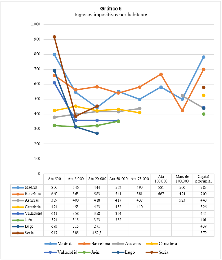 31. Simplificando a diversidade mediante segmentos de poboación, xa non sempre aparece o gráfico en forma de “U” ao que xa se fixo referencia en relación cos ingresos totais por habitante (gráficos 1.1 a 1.8). Madrid, Valladolid, Lugo e Soria seguen mostrando máis ingresos impositivos por habitante para os concellos moi pequenos e para as respectivas capitais, pero este dato xa non está claramente presente en Barcelona, Asturias, Cantabria e Jaén. Por outro lado, tamén se comproba que entre as oito provincias hai diferenzas basais moi acusadas. En case todos os seus segmentos demográficos, os concellos de Madrid e Barcelona orzan un terzo máis de ingresos impositivos que os correspondentes concellos das demais provincias (gráfico 6), co cal, malia haber diferenzas de ingresos impositivos entre os segmentos demográficos de cada provincia, máis evidente é a diferenza entre os concellos de Madrid e Barcelona e os das demais provincias. E máis clara aínda é a diferenza entre os concellos de Madrid e Barcelona e todos os demais concellos considerados (agás os moi pequenos de Valladolid e os dous de Lugo).