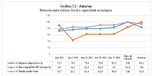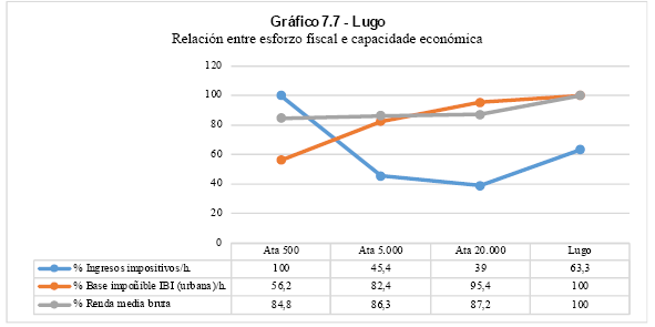 53. O financiamento mediante impostos propios é relativamente homoxéneo en todos os concellos. Nos concellos pequenos e moi pequenos o esforzo fiscal per capita é alto, homólogo ou mesmo superior ao das grandes cidades. Para valorar o significado do esforzo fiscal en cada concello, cómpre poñer en relación a carga impositiva per capita con indicadores de capacidade económica e tributaria (como as bases impoñibles do IBI e a renda bruta media en cada concello). Desta conexión non derivan resultados claros, aínda que si se pode falar de que nos concellos moi pequenos, pequenos e medianos hai maior proximidade entre o esforzo fiscal per capita e a capacidade económica. Dada a homoxeneidade na carga impositiva per capita na maioría dos concellos, e dado que normalmente nestes concellos a propiedade inmoble ten menos valor e as rendas son máis baixas, o esforzo fiscal real dos veciños destes concellos pode ser comparativamente máis elevado.