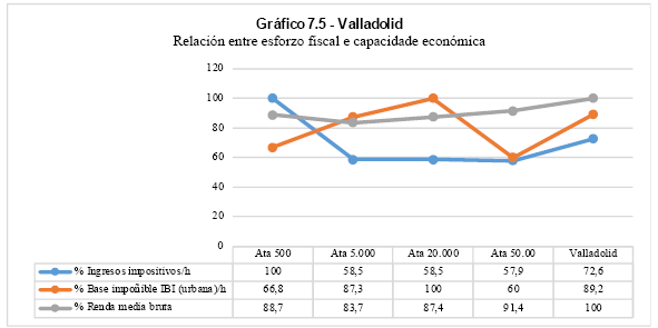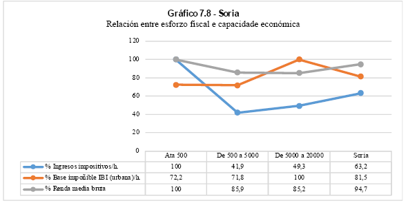 36. Co fin de valorar o significado do esforzo fiscal en cada concello, convén poñer en relación a carga impositiva municipal per capita coa capacidade económica ou contributiva, tamén por habitante e en cada concello. Esta relación exprésase nos gráficos 7.1 a 7.8. A conexión mencionada fíxose mediante dous indicadores de capacidade económica: as bases impoñibles medias do IBI urbano por habitante en cada concello (conforme os valores catastrais vixentes en 2020); e a renda bruta media suxeita ao IRPF en cada concello, segundo as bases de datos da Axencia Tributaria para 2019. As tres magnitudes relacionadas (esforzo fiscal por habitante, base impoñible media do IBI/h. e renda bruta media) son dificilmente comparables e representables de forma directa. Por iso, aquí optouse por unha comparación só relativa (para cada segmento de poboación). Desta maneira, ao segmento de concellos coa magnitude máis elevada en cada indicador (esforzo fiscal, base impoñible do IBI e renda bruta media) déuselle o valor 100, calculándose as magnitudes dos demais segmentos demográficos por referencia á máis alta. Así, por exemplo, se na provincia de Soria a renda bruta media máis elevada se dá no segmento de concellos máis pequenos (< 500 h.), a esta magnitude asígnaselle o valor 100 e, respecto dela, o segundo segmento de concellos con renda bruta media máis alta presentará unha magnitude máis baixa (94,7, para o caso de Soria capital), e así sucesivamente. Deste xeito, homoxeneizando todos os valores sobre a base de 100, pódense comparar os datos de esforzo fiscal e de capacidade económica en cada grupo de concellos. Na representación gráfica que segue, canto máis alta se atope a liña dos ingresos impositivos por habitante (liña azul), maior será a correlación entre esforzo fiscal e capacidade contributiva. Pola contra, canto máis baixa se encontre a liña dos ingresos impositivos por habitante, e máis afastada das dúas liñas que indican a capacidade contributiva, menor será a correlación entre esforzo fiscal e capacidade contributiva.