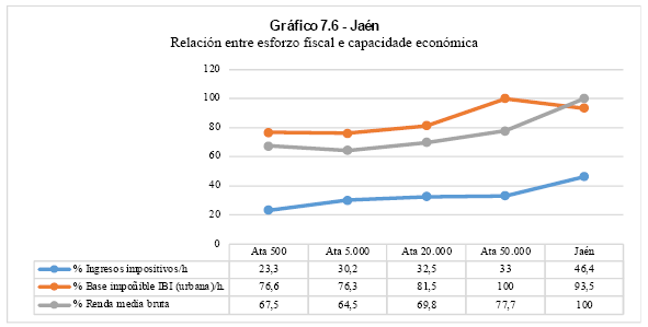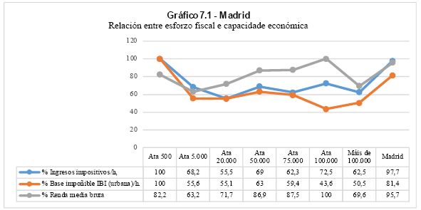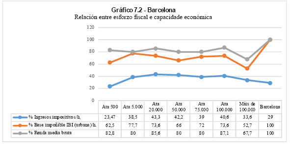 38. Polo outro extremo, nas capitais de cada provincia obsérvase unha menor correlación relativa entre esforzo impositivo e capacidade económica. Así sucede en Barcelona, Asturias, Cantabria, Valladolid e Jaén. O caso que máis chama a atención é o de Barcelona, onde simultaneamente se dá un esforzo fiscal comparativamente baixo e a capacidade económica máis alta. En ocasións, as capitais de provincia orzan importantes ingresos impositivos por habitante (o que en principio indica un alto esforzo fiscal), pero esta maior carga tributaria vai parella a unha capacidade contributiva por habitante notablemente superior, co que ao final o esforzo impositivo real, unha vez posto en relación coa capacidade económica media, é igual ou menor que o dos demais concellos. Dúas son as excepcións á baixa correlación entre esforzo impositivo e capacidade económica nas capitais provinciais. Por unha banda, a cidade de Madrid mostra moita proximidade entre o esforzo impositivo por habitante e as magnitudes de capacidade económica, co cal, malia ser é certo que nesta cidade a capacidade económica é substancialmente máis alta (sobre todo en renda, máis que en valores inmobiliarios medios) esa maior capacidade contributiva corre simétrica a unha maior carga impositiva per capita. A notoria diferenza comparativa entre Madrid e Barcelona pode deberse á propia composición demográfica das dúas cidades: no caso de Barcelona, os barrios periféricos con rendas máis baixas non forman parte da cidade, senón doutros concellos metropolitanos; en cambio, Madrid si incorpora eses barrios metropolitanos con menor capacidade económica ao propio concello. A outra excepción mencionada está nas dúas capitais máis pequenas, Lugo e Soria, onde o maior esforzo tributario dos veciños non se compensa cunha maior capacidade económica media.