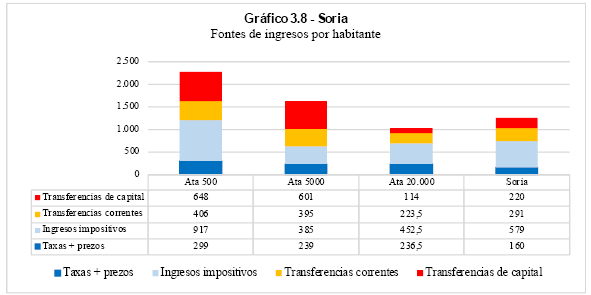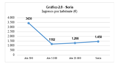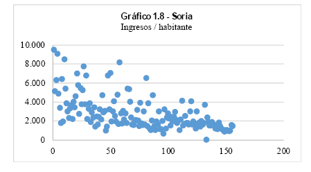 19. Os datos da provincia de Soria tamén se poden representar graficamente –aínda que con menos nitidez– por medio dunha curva en forma de “U”, onde os concellos que orzan máis ingresos son os moi pequenos (< 500 h.) e a capital provincial. O singular de Soria é que teñen moitos concellos moi pequenos (164), o que mellora a fiabilidade da media estatística para este segmento. En cambio, ten só dous concellos medianos (< 20.000 h.), Burgo de Osma (5.034 h.) e Almazán (5.411 h.). A reducida poboación destes dous concellos pode explicar a similitude entre os ingresos deste grupo e os do grupo dos concellos pequenos (< 5.000 h.). Soria capital orza máis ingresos (1.458 €/h.) que os concellos pequenos (1.182 €/h.) e medianos (1.298 €/h.), aínda que a diferenza non é tan ostensible como en Madrid, Barcelona ou Valladolid.