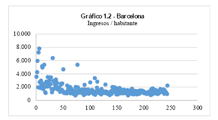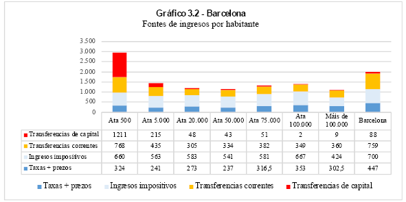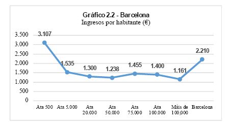13. A provincia de Barcelona de novo repite o gráfico en forma de “U” que se observa nas outras provincias analizadas (gráfico 2.2). E de novo os concellos máis pequenos (< 500 h.) son os que orzan máis ingresos por habitante. En concreto, a media de ingresos deste grupo duplica a do seguinte segmento (concellos de entre 501 e 5.000 habitantes). Tamén, igual que sucede coa cidade de Madrid, a cidade de Barcelona orza moitos máis ingresos per capita que os demais concellos da provincia, agás os moi pequenos. E de novo as diferenzas son moi notables. Entre os concellos medianos (de entre 5.001 e 20.000 h.) e Barcelona hai unha diferenza orzada de 900 € por habitante. Por último, tamén aquí se observa, igual que na Comunidade de Madrid, que a referencia dos 75.000 habitantes, determinante do réxime especial de transferencias estatais conforme o artigo 111 LFL, non depara unha maior previsión bruta de ingresos. Ao contrario, o grupo de concellos de máis 100.001 habitantes é o que orza menos ingresos per capita en toda a provincia.