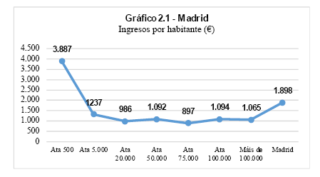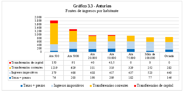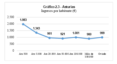 14. No Principado de Asturias, comunidade uniprovincial, os concellos moi pequenos (< 500 h.) e os pequenos (< 5.000 h.) presentan os orzamentos de ingresos máis elevados (gráfico 2.3). Os demais concellos amosan datos moi similares. Con moi pouca diferenza respecto dos demais, Avilés (77.791 h.) é o concello que prevé maiores ingresos por habitante, por enriba da cidade máis poboada (Xixón) e da capital provincial (Oviedo). En todo caso, os ingresos orzados por estes concellos non se diferencian substancialmente dos do grupo máis numeroso (de entre 5.001 e 20.000 h.). Isto suxire que o réxime financeiro especial dos grandes concellos (art. 111 LFL) non depara por si maiores ingresos.
