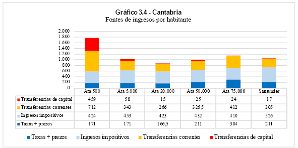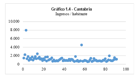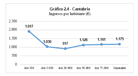 15. A Comunidade uniprovincial de Cantabria, igual que Asturias, mostra unha alta homoxeneidade de ingresos orzados entre os diversos grupos de concellos, coa única excepción dos concellos moi pequenos (< 500 h.), que prevén ingresos moito máis elevados (gráfico 2.4). Séguelles a capital provincial, Santander (173.375 h.), aínda que xa con cifras moi similares ás dos demais concellos. Dada a similitude nos datos, pódese considerar que o réxime especial de grandes cidades (art. 111 LFL) non xera por si grandes diferenzas orzamentarias.