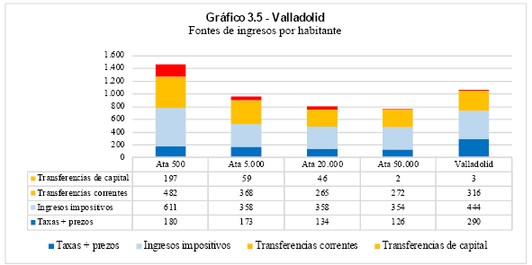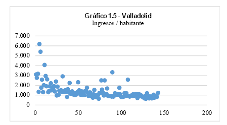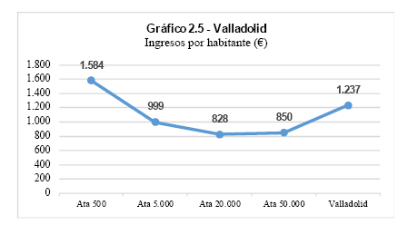 16. No caso da provincia de Valladolid, a xa mencionada curva con forma de “U” está moi achatada (gráfico 2.5). Isto é, os concellos con máis ingresos orzados por habitante son os máis pequenos e o máis grande. Os concellos pequenos (de ata 5.000 h.) e medianos (de ata 20.000 h.) orzan menos ingresos (téñase en conta, ademais, que na provincia de Valladolid ningún concello agás a capital supera os 25.000 habitantes). As diferenzas son, ademais, conspicuas entre os concellos do centro e dos extremos do “U”: a media de ingresos orzados dos concellos moi pequenos case dobra a dos concellos medianos (de entre 5.001 e 20.000 habitantes); e a cidade de Valladolid orza 1.237 € per capita, cantidade moi superior aos 828 € per capita que de media orzan os concellos medianos (de entre 5.001 e 20.000 habitantes).