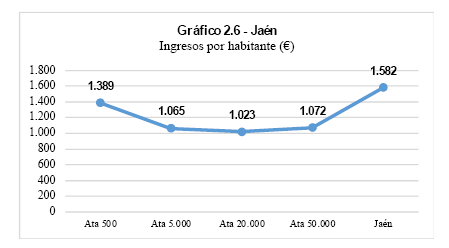 17. A provincia de Jaén reproduce, con algunha singularidade, o gráfico en forma de “U” das outras tres provincias (gráfico 2.6). Os concellos con maior previsión de ingresos son tanto os máis pequenos (de ata 500 habitantes) como o máis grande (Jaén). Aínda que neste caso a capital provincial orza mesmo máis ingresos que a media dos concellos máis pequenos29. Con todo, hai que ter en conta que na provincia de Jaén só son cinco os concellos de menos de 500 habitantes e ningún deles prevé ingresos extravagantes, afastados da media. Por outro lado, aínda que o patrón orzamentario é simétrico ao das outras provincias, neste caso as diferenzas relativas son moito menores. A maior diferenza dáse entre os concellos pequenos (de entre 501 e 5.000 habitantes) e a cidade de Jaén nunha contía de 559 €/h. Aquí non se pode apreciar o hipotético efecto do réxime especial de transferencias estatais propio dos concellos grandes (art. 111 LFL), ao non haber ningún concello de máis de 75.000 habitantes (ademais da capital).