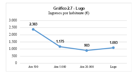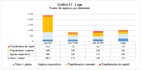 Sumario: 1 Introdución. 2 Ingresos totais por habitante. 3 Relación entre ingresos, gastos e custos. 4 Estrutura dos ingresos. 5 Ingresos impositivos. 5.1 Peso relativo dos ingresos impositivos. 5.2 Ingresos impositivos por habitante. 5.3 Ingresos impositivos e capacidade económica. 6 Ingresos por transferencias. 7 Resultados. 8 Anexo metodolóxico.