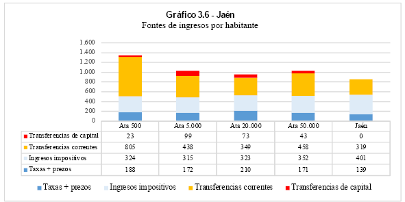 29 Os datos de ingresos sobre a cidade de Jaén deben lerse cunha advertencia: no orzamento para 2021 (que é a quinta prórroga do orzamento de 2017) inclúese como previsión de ingresos patrimoniais por concesión demanial unha cantidade inusitadamente alta: 81.049.325 € (isto é, unha cantidade que dobra o orzamento de ingresos por impostos municipais). Non só está cantidade é inusitadamente alta, senón que, ademais, na liquidación do idéntico orzamento para 2020 (que tamén era prórroga do de 2017) consta que houbo un defecto de ingreso efectivo (respecto do orzado) de 80.565.508 €. Polo demais, esta previsión orzamentaria, aínda que non fose efectiva, non se pode considerar un erro, pois tamén no orzamento de 2016 (o anterior ao de 2017 prorrogado ata 2021) figura unha cantidade aproximada de 60 millóns de euros por ingresos patrimoniais (concesións demaniais e dereitos de superficie). A elevada previsión de ingresos patrimoniais ten como consecuencia que máis adiante, cando se poñan en relación só os ingresos impositivos e as transferencias, se observará que a suma deses dous conceptos (que na maioría dos concellos alcanza o 80 % dos ingresos), no caso de Jaén presenta unha cifra moi inferior.