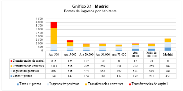 25. Como se explicou xa máis arriba (supra § 11) e se observa máis adiante nos gráficos 3.1 a 3.8, con carácter xeral os concellos que orzan máis ingresos per capita son os moi pequenos (< 500 h.) e as capitais de provincia. É sobre todo significativo o grupo dos concellos pequenos e moi pequenos, que simultaneamente prevén altos ingresos por impostos propios, por transferencias correntes e por transferencias de capital. Neste sentido, malia ser certo que os concellos pequenos e moi pequenos son os que orzan máis ingresos, non o fan só con cargo a transferencias, senón tamén mediante un esforzo fiscal similar ou mesmo ás veces superior ao dos demais segmentos de concellos38. Este alto esforzo fiscal permite cuestionar, polo menos en termos xerais, a hipótese do sobrefinanciamento rural ou da “ilusión fiscal” nos concellos pequenos e moi pequenos. Do mesmo xeito, a pesar de que as cidades máis grandes adoitan contar con máis ingresos, isto non se debe na mesma medida a un maior esforzo impositivo, senón en gran medida a cuantiosas transferencias correntes.