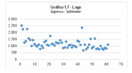 18. Algo singular é o caso de Lugo, aínda que non tanto como para cuestionar a curva de “U” que caracteriza a previsión de impostos das oito provincias analizadas. Lugo non ten concellos de máis de 20.000 h. (agás a capital). Co cal, a curva de “U” é máis difícil de trazar. Non obstante, séguese observando que os concellos moi pequenos (que só son dous) e os concellos pequenos (de entre 501 h. e 5.000 h.), que é o grupo máis numeroso, presentan os datos medios de ingresos máis altos. Séguelles a capital provincial (1.093 €/h.) e, xa por último, os concellos medianos (de entre 5.001 e 20.000 h.) coa cifra de 902 €/h. Neste sentido, e no que importa para este estudo, os concellos que orzan menos ingresos son os medianos, que son os chamados a vertebrar as súas bisbarras.