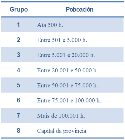59. Co fin de identificar patróns ou tendencias, os concellos analizados neste estudo agrupáronse por grupos de poboación, segundo os datos demográficos oficiais publicados polo Instituto Nacional de Estatística referidos a 2020 (Real decreto 1147/2020, do 15 de decembro, polo que se declaran oficiais as cifras de poboación resultantes da revisión do padrón municipal referidas ao 1 de xaneiro de 2020). Partiuse dos grupos de poboación utilizados para fins estatísticos polo Ministerio de Facenda, pero a eses grupos engadíronse outros. Para os efectos estatísticos, e seguindo a escala que marca o artigo 26.1 LBRL para a fixación de servizos obrigatorios, o Ministerio de Facenda distingue entre concellos de ata 5.000, 20.000 e 50.000 habitantes. A estas agrupacións o Ministerio engade, como propia, a de ata 100.000 habitantes. Para os efectos deste estudo, centrado nos problemas da despoboación rural, desagregouse o grupo de concellos menores de 500 habitantes, que é moi numeroso nalgunhas provincias da meseta e que mostra singularidades financeiras notorias. Tamén, co fin de valorar o efecto de centralidade comarcal ou rexional das capitais provinciais, non necesariamente correlativo á súa poboación, estas cidades consideráronse como un segmento singular. Por último, tamén se distinguiron os concellos con máis de 75.000 habitantes –que se atopan só na metade das provincias analizadas– co fin de rastrexar os posibles efectos financeiros do réxime especial de grandes concellos que establece o artigo 111 LFL.