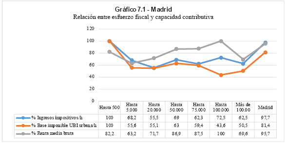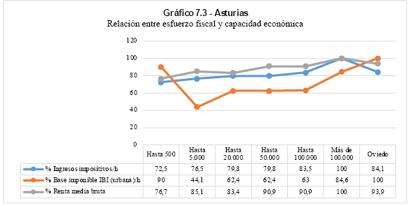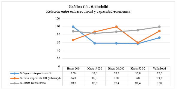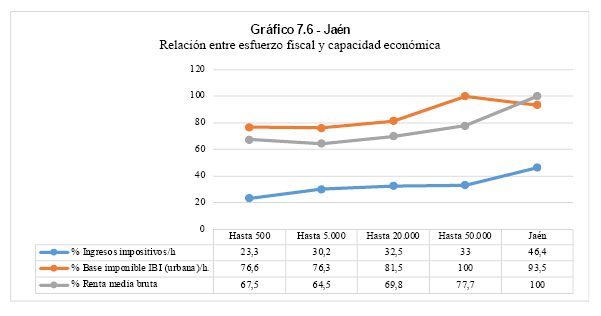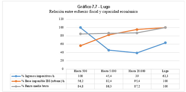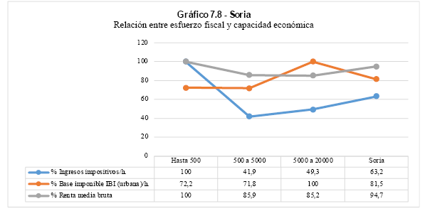 36. A fin de valorar el significado del esfuerzo fiscal en cada municipio, conviene poner en relación la carga impositiva municipal per cápita con la capacidad económica o contributiva, también por habitante y en cada municipio. Esta relación se expresa en los gráficos 7.1 a 7.8. La conexión mencionada se ha hecho mediante dos indicadores de capacidad económica: las bases imponibles medias del IBI urbano por habitante en cada municipio (conforme a los valores catastrales vigentes en 2020); y la renta bruta media sujeta al IRPF en cada municipio, según las bases de datos de la Agencia Tributaria para 2019. Las tres magnitudes relacionadas (esfuerzo fiscal por habitante, base imponible media del IBI/h. y renta bruta media) son difícilmente comparables y representables de forma directa. Por ello, aquí se ha optado por una comparación sólo relativa (para cada segmento de población). De esta forma, al segmento de municipios con la magnitud más elevada en cada indicador (esfuerzo fiscal, base imponible del IBI y renta bruta media) se le ha dado el valor 100, calculándose las magnitudes de los demás segmentos demográficos por referencia a la más alta. Así, por ejemplo, si en la provincia de Soria la renta bruta media más elevada se da en el segmento de municipios más pequeños (< 500 h.), a esta magnitud se le asigna el valor 100 y, respecto de ella, el segundo segmento de municipios con renta bruta media más alta presentará una magnitud más baja (94,7, para el caso de Soria capital), y así sucesivamente. De esta manera, homogeneizando todos los valores sobre la base de 100, se pueden comparar los datos de esfuerzo fiscal y de capacidad económica en cada grupo de municipios. En la representación gráfica que sigue, cuanto más alta se encuentre la línea de los ingresos impositivos por habitante (línea azul), mayor será la correlación entre esfuerzo fiscal y capacidad contributiva. Por el contrario, cuanto más baja se encuentre la línea de los ingresos impositivos por habitante, y más alejada de las dos líneas que indican la capacidad contributiva, menor será la correlación entre esfuerzo fiscal y capacidad contributiva.