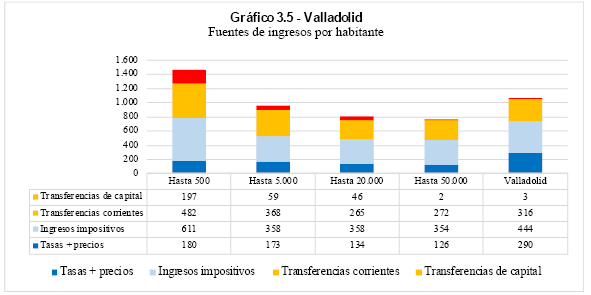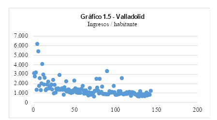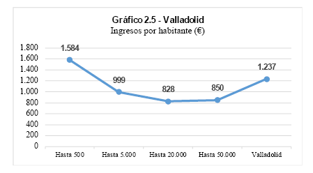 16. En el caso de la provincia de Valladolid, la ya mencionada curva con forma de “U” está muy achatada (gráfico 2.5). Esto es, los municipios con más ingresos presupuestados por habitante son los más pequeños y el más grande. Los municipios pequeños (de hasta 5.000 h.) y medianos (de hasta 20.000 h.) presupuestan menos ingresos (téngase en cuenta, además, que en la provincia de Valladolid ningún municipio excepto la capital supera los 25.000 habitantes). Las diferencias son, además, conspicuas entre los municipios del centro y de los extremos de la “U”: la media de ingresos presupuestados de los municipios muy pequeños casi dobla a la de los municipios medianos (de entre 5.001 y 20.000 habitantes); y la ciudad de Valladolid presupuesta 1.237 € per cápita, cantidad muy superior a los 828 € per cápita que de media presupuestan los municipios medianos (de entre 5.001 y 20.000 habitantes).
