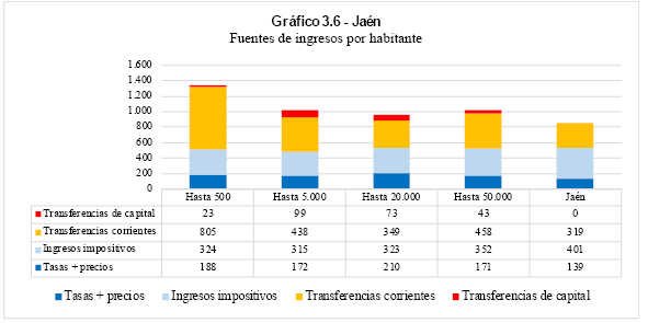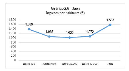 17. La provincia de Jaén reproduce, con alguna singularidad, el gráfico en forma de “U” de las otras tres provincias (gráfico 2.6). Los municipios con mayor previsión de ingresos son tanto los más pequeños (de hasta 500 habitantes) como el más grande (Jaén). Aunque en este caso la capital provincial presupuesta incluso más ingresos que la media de los municipios más pequeños29. Con todo, hay que tener en cuenta que en la provincia de Jaén sólo son cinco los municipios de menos de 500 habitantes y ninguno de ellos prevé ingresos extravagantes, alejados de la media. Por otro lado, aunque el patrón presupuestario es simétrico al de las otras provincias, en este caso las diferencias relativas son mucho menores. La mayor diferencia se da entre los municipios pequeños (de entre 501 y 5.000 habitantes) y la ciudad de Jaén en una cuantía de 559 €/h. Aquí no se puede apreciar el hipotético efecto del régimen especial de transferencias estatales propio de los municipios grandes (art. 111 LHL), al no haber ningún municipio de más de 75.000 habitantes (además de la capital).