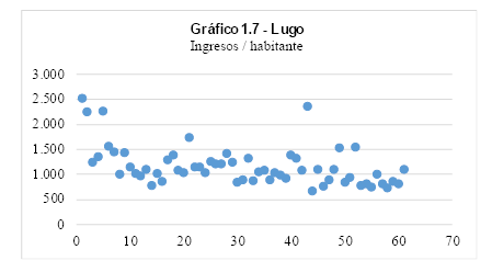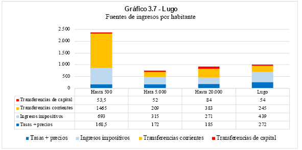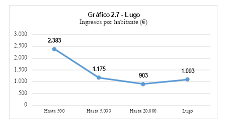 18. Algo singular es el caso de Lugo, aunque no tanto como para cuestionar la curva de “U” que caracteriza la previsión de impuestos de las ocho provincias analizadas. Lugo no tiene municipios de más de 20.000 h. (excepto la capital). Con lo cual, la curva de “U” es más difícil de trazar. Con todo, se sigue observando que los municipios muy pequeños (que sólo son dos) y los municipios pequeños (de entre 501 h. y 5.000 h.), que es el grupo más numeroso, presentan los datos medios de ingresos más altos. Les sigue la capital provincial (1093 €/h.) y, ya por último, los municipios medianos (de entre 5.001 y 20.000 h.) con la cifra de 902 €/h. En este sentido, y en lo que importa para este estudio, los municipios que presupuestan menos ingresos son los medianos, que son los llamados a vertebrar sus comarcas.