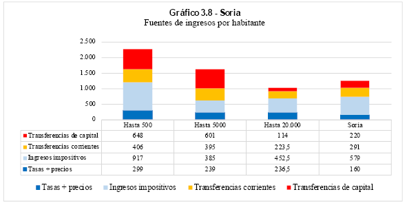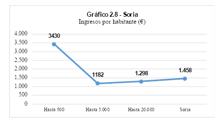19. Los datos de la provincia de Soria también se pueden representar gráficamente –aunque con menos nitidez– por medio de una curva en forma de “U”, donde los municipios que presupuestan más ingresos son los muy pequeños (< 500 h.) y la capital provincial. Lo singular de Soria es que tienen muchos municipios muy pequeños (164), lo que mejora la fiabilidad de la media estadística para este segmento. En cambio, tiene sólo dos municipios medianos (< 20.000 h.), Burgo de Osma (5.034 h.) y Almazán (5.411 h.). La reducida población de estos dos municipios puede explicar la similitud entre los ingresos de este grupo y los del grupo de los municipios pequeños (< 5.000 h.). Soria capital presupuesta más ingresos (1.458 €/h.) que los municipios pequeños (1.182 €/h.) y medianos (1.298 €/h.), aunque la diferencia no es tan ostensible como en Madrid, Barcelona o Valladolid.