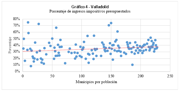 27. En lo que sigue se ha prestado atención solo a los dos grupos de ingresos más relevantes cuantitativamente, los ingresos impositivos propios y las transferencias de otras administraciones públicas, que suman de media el 82 por 100 de los ingresos municipales40. Se han dejado fuera las tasas y los precios, por su moderada relevancia cuantitativa41 y por su difícil identificación contable, ligada a la forma de gestión de cada servicio municipal. En general, se observa una gran diversidad en el porcentaje de ingresos impositivos, fundamentalmente en los municipios muy pequeños. Así se observa de forma ejemplar en el gráfico 4, referido a los ingresos impositivos presupuestados en los municipios de Valladolid. En los municipios muy pequeños, que son la abrumadora mayoría en la provincia, la diversidad de fuentes de ingresos es elevadísima, yendo desde el 75 % al 10 % de ingresos presupuestados por ingresos municipales. Entre los municipios pequeños y medianos las diferencias se reducen, oscilando entre el 30 % y el 40 %. En este punto de nuevo hay que insistir en que para los municipios muy pequeños un solo concepto de ingreso muy relevante (como una transferencia de capital elevada) afecta decisivamente a la composición de todo el presupuesto (supra § 9).