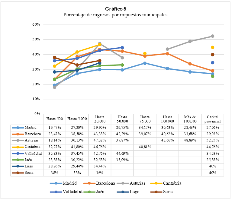 28. Agrupados por segmentos de población, en los municipios de las ocho provincias hay un patrón claro sobre la proporción de ingresos impositivos (directos e indirectos) respecto del total de ingresos presupuestados (gráfico 5). En todas las provincias –menos en Soria– los municipios más pequeños (< 500 h.) son los que presupuestan menos ingresos impositivos. En estos ayuntamientos son muy cuantiosas las transferencias; esto probablemente se deba más al mayor coste de la actividad municipal que a un menor esfuerzo fiscal (supra § 20). Conforme aumenta la población, crece también el porcentaje de financiación impositiva, pero no de una forma lineal: en las dos ciudades más grandes (Madrid y Barcelona), así como en Valladolid, el porcentaje de financiación impositiva es inferior al de todos los demás municipios de sus provincias (excepto los muy pequeños). Aquí se observa una diferencia importante entre las tres ciudades más grandes y las demás capitales de provincia, donde el porcentaje de financiación impositiva es siempre superior al de los demás segmentos demográficos. Con todo, como luego se verá, Madrid, Barcelona y Valladolid presentan un alto nivel de esfuerzo fiscal (infra § 30), con lo cual la baja proporción de financiación impositiva no se debe a un bajo esfuerzo fiscal, sino a una elevada cantidad de transferencias, claramente creciente en los últimos años42 y, en menor medida, a los mayores ingresos por tasas y precios.