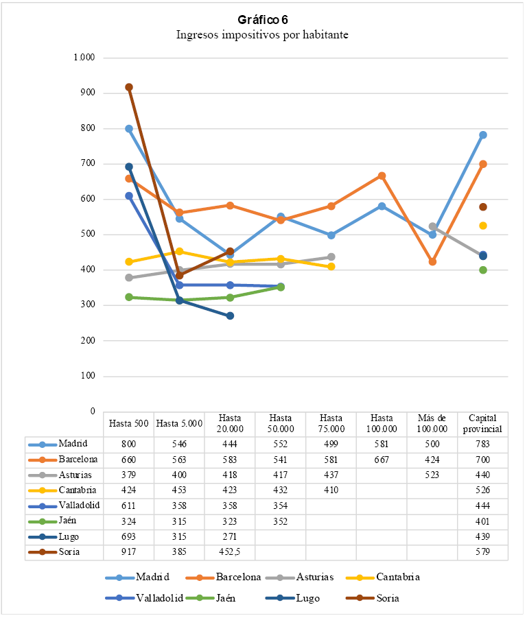 31. Simplificando la diversidad mediante segmentos de población, ya no siempre aparece el gráfico en forma de “U” al que ya se hecho referencia en relación con los ingresos totales por habitante (gráficos 1.1 a 1.8). Madrid, Valladolid, Lugo y Soria siguen mostrando más ingresos impositivos por habitante para los municipios muy pequeños y para las respectivas capitales, pero este dato ya no está claramente presente en Barcelona, Asturias, Cantabria y Jaén. Por otro lado, también se comprueba que entre las ocho provincias hay diferencias basales muy acusadas. En casi todos sus segmentos demográficos, los municipios de Madrid y Barcelona presupuestan un tercio más de ingresos impositivos que los correspondientes municipios de las demás provincias (gráfico 6), con lo cual, si bien hay diferencias de ingresos impositivos entre los segmentos demográficos de cada provincia, más evidente es la diferencia entre los municipios de Madrid y Barcelona y los de las demás provincias. Y aún más clara es la diferencia entre los municipios de Madrid y Barcelona y todos los demás municipios considerados (excepto los muy pequeños de Valladolid y los dos de Lugo).