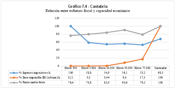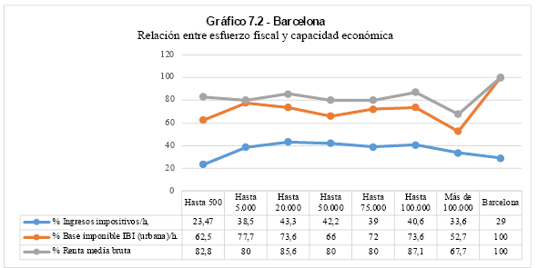 53. La financiación mediante impuestos propios es relativamente homogénea en todos los municipios. En los municipios pequeños y muy pequeños el esfuerzo fiscal per cápita es alto, homólogo o incluso superior al de las grandes ciudades. Para valorar el significado del esfuerzo fiscal en cada municipio, es necesario poner en relación la carga impositiva per cápita con indicadores de capacidad económica y tributaria (como las bases imponibles del IBI y la renta bruta media en cada municipio). De esta conexión no derivan resultados claros, aunque sí se puede hablar de que en los municipios muy pequeños, pequeños y medianos hay mayor proximidad entre el esfuerzo fiscal per cápita y la capacidad económica. Dada la homogeneidad en la carga impositiva per cápita en la mayoría de los municipios, y dado que normalmente en estos municipios la propiedad inmueble tiene menos valor y las rentas son más bajas, el esfuerzo fiscal real de los vecinos de estos municipios puede ser comparativamente más elevado.