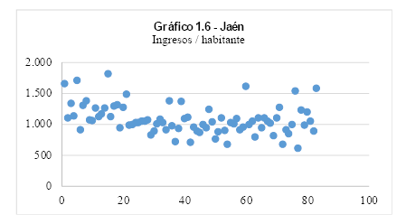 9. Tal y como se muestra en los gráficos 1.1 a 1.8, para los ingresos municipales por habitante hay un alto grado de dispersión o diversidad entre los ayuntamientos de un mismo grupo demográfico, sobre todo en los municipios muy pequeños (menos de 500 habitantes). Dado su pequeño tamaño y población, en estos municipios la posible previsión presupuestaria de un solo ingreso impositivo inusitadamente alto (por ejemplo, porque en ese municipio tiene su sede una gran empresa que tributa en el impuesto de actividades económicas), o la previsión de un ingreso por precios de una pequeña empresa municipal de transformación agraria22, o una sola transferencia de capital cuantiosa (para una infraestructura esencial, por ejemplo), puede ofrecer una cifra de financiación muy abultada23. Esas posibles cuantías extraordinarias tanto afectan al grado de dispersión estadística como a los valores medios de ingresos en los distintos grupos de población. En general, y dejando ahora al margen a los municipios muy pequeños, la diversidad en los ingresos municipales se reduce en proporción inversa a la población. Aun así, incluso en los municipios medianos (de entre 5.001 y 20.000 habitantes) se observan algunas diferencias importantes, sólo explicables por factores singulares de cada municipio. Según esto, incluso dentro de un mismo grupo demográfico hay diferencias ostensibles de ingresos, no explicables a través del régimen legal de financiación local, sino por factores específicos de algunos municipios, entre los que se pueden incluir no sólo condicionantes socioeconómicos, sino también el nivel de responsabilidad fiscal y las políticas públicas –más o menos activas para el aseguramiento de ingresos– de cada ayuntamiento. De las ocho provincias consideradas, Jaén es la que presenta menor diversidad de ingresos municipales per cápita, aunque hay que tener en cuenta que en esta provincia apenas si hay 5 municipios menores de 500 habitantes, y es precisamente este grupo de municipios el que en otras provincias presenta un mayor grado de diversidad en los ingresos municipales por habitante.