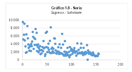 24 En el gráfico 1.8 se han suprimido los datos de dos municipios, porque al ser muy elevados distorsionan el conjunto del gráfico. Se trata, en primer lugar, del Municipio de Valdelagua del Cerro (Soria), que en el presupuesto incluye un ingreso de 424.000 € en concepto de inversiones de capital. También se ha omitido del gráfico 1.8 el Municipio de Suellacabras, que presupuesta 145.900 € de ingresos patrimoniales, lo que dividido entre sus 25 vecinos arroja una cifra de ingresos presupuestados por habitante no encuadrable en el gráfico.