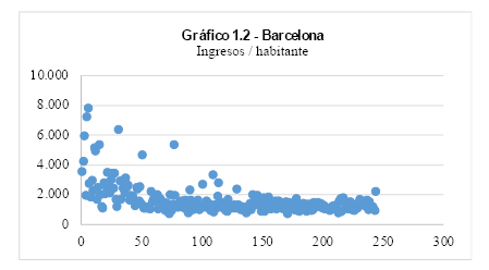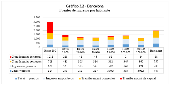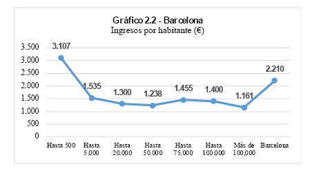 13. La provincia de Barcelona de nuevo repite el gráfico en forma de “U” que se observa en las otras provincias analizadas (gráfico 2.2). Y de nuevo los municipios más pequeños (< 500 h.) son los que presupuestan más ingresos por habitante. En concreto, la media de ingresos de este grupo duplica a la del siguiente segmento (municipios de entre 501 y 5.000 habitantes). También, al igual que ocurre con la ciudad de Madrid, la ciudad de Barcelona presupuesta muchos más ingresos per cápita que los demás municipios de la provincia, excepto los muy pequeños. Y de nuevo las diferencias son muy notables. Entre los municipios medianos (de entre 5.001 y 20.000 h.) y Barcelona hay una diferencia presupuestada de 900 € por habitante. Por último, también aquí se observa, al igual que en la Comunidad de Madrid, que la referencia de los 75.000 habitantes, determinante del régimen especial de transferencias estatales conforme al artículo 111 LHL, no depara una mayor previsión bruta de ingresos. Al contrario, el grupo de municipios de más 100.001 habitantes es el que presupuesta menos ingresos per cápita en toda la provincia.
