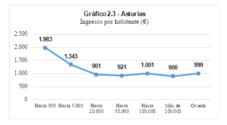 14. En elPrincipado de Asturias, comunidad uniprovincial, los municipios muy pequeños (< 500 h.) y los pequeños (< 5.000 h.) presentan los presupuestos de ingresos más elevados (gráfico 2.3). Los demás municipios presentan datos muy similares. Con muy poca diferencia respecto de los demás, Avilés (77.791 h.) es el municipio que prevé mayores ingresos por habitante, por encima de la ciudad más poblada (Gijón) y de la capital provincial (Oviedo). En todo caso, los ingresos presupuestados por estos municipios no se diferencian sustancialmente de los del grupo más numeroso (de entre 5.001 y 20.000 h.). Esto sugiere que el régimen financiero especial de los grandes municipios (art. 111 LHL) no depara por sí mayores ingresos.