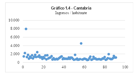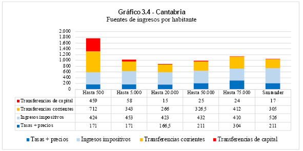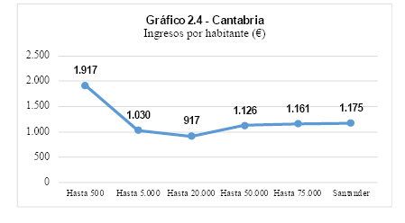 15. La Comunidad uniprovincial de Cantabria, al igual que Asturias, muestra una alta homogeneidad de ingresos presupuestados entre los diversos grupos de municipios, con la única excepción de los municipios muy pequeños (< 500 h.), que prevén ingresos mucho más elevados (gráfico 2.4). Les sigue la capital provincial, Santander (173.375 h.), aunque ya con cifras muy similares a las de los demás municipios. Dada la similitud en los datos, se puede considerar que el régimen especial de grandes ciudades (art. 111 LHL) no genera por sí grandes diferencias presupuestarias.