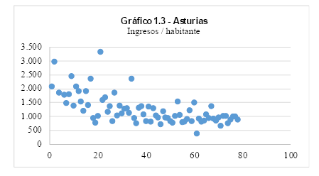 10. Un dato significativo es que, aunque en todas las provincias hay notables diferencias de ingresos entre los distintos municipios, el rango en el que se mueven esas diferencias varía de provincia a provincia. Así, aunque la mayoría de los municipios de las ocho provincias presupuestan ingresos entre 1.000 y 2.000 €/h., en el caso de Madrid, Barcelona y Valladolid hay un número considerable de municipios muy pequeños, pequeños y medianos que presupuestan en torno a los 3.000 €/h. (gráficos 1.1, 1.2 y 1.3). Estos casos son más excepcionales en Asturias, Cantabria y Lugo y por completo inexistentes en el caso de Jaén, donde ningún municipio cuantifica ingresos por habitante superiores a los 2.000 €. Muy llamativo es el caso de Soria24, donde las diferencias de ingresos presupuestados, incluso dentro de un mismo segmento demográfico, son muy elevadas. Esto puede explicarse por que el artículo 124.2 LHL garantiza a todos los municipios que la participación en los ingresos estatales no será en ningún caso inferior a la de 2003. Esta regla, en el caso de los municipios que pierden población de forma acelerada (los muy pequeños), les asegura un nivel relativamente alto de transferencias.