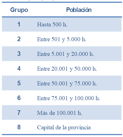 7. Para la formación de la base de datos de este estudio, se han consultado los documentos de información presupuestaria remitidos por cada municipio al Ministerio de Hacienda, en cumplimiento del artículo 169.4 de la Ley de haciendas locales (Real decreto legislativo 2/2004, de 5 de marzo: LHL). Para los fines de la comparación, esa base de datos presupuestaria se ha combinado con los datos oficiales de población para 2020 (año en el que se elaboran los presupuestos para 2021). De esta manera, los datos que se mencionan a continuación se refieren a ingresos presupuestados per cápita. Con estos datos, se han formado hasta ocho grupos de municipios, aunque no todos los grupos están presentes en las ocho provincias. En todas las provincias se ha singularizado la capital de provincia, en la medida en que normalmente es el municipio más poblado de cada provincia (excepto en Asturias) y suele cumplir una función territorial específica, como centro económico tradicional y de servicios para el conjunto de la provincia. Por otro lado, los grupos no son homogéneos. Se han formado para los objetivos específicos de este estudio y a partir de dos escalas normativas: la del artículo 26.1 LBRL (sobre servicios obligatorios); y la distinción, a efectos de transferencias estatales, entre municipios de más y menos de 75.000 habitantes (art. 111 LHL). La relación completa de los grupos de municipios por población que se utiliza en este estudio se muestra en la tabla 1.