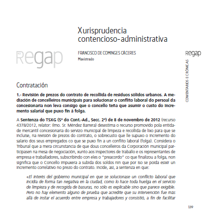 Explicación de diferentes sentenzas apoianda a Administración Local para: Competencia dos Concellos para autorizar e condicionar a instalación de estacións e antenas de telefonía móbil, Reclamacións de pagamento de contratistas das Administracións locais. Inaplicación das medidas cautelares contra a inactividade administrativa establecidas na reforma da Lei de loita contra a morosidade aos contratos celebrados antes da súa entrada en vigor, Servizo de recollida e tratamento de lixos. Natureza de taxa e non de prezo público. Servizo obrigatorio. Deber de pagamento con independencia de que o inmoble ao que se refire a taxa xere ou non residuos, Anulación de orzamentos municipais por non ter sido obxecto de negociación colectiva.