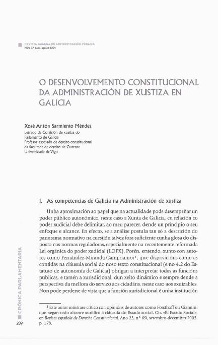 - Xosé Antón Sarmiento Méndez, O estado social e democrático de dereito e as súas proxeccións parlamentarias no caso galego , Revista Galega de Administración Pública: Vol. 1 Núm. 39 (2005)