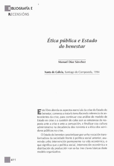 Este libro aborda os aspectos esenciais da crise do Estado do benestar; comenza a trata-lo tema facendo referencia ós antecedentes da crise, para continuar coa análise do modelo de Estado en crise e a cuestión de cales son as estratexias de resposta ante a crise e ante a corrupción, e finalizar coa cultura administrativa na decadencia dos noventa e a ética dos servidores públicos na crise.