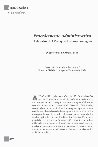 A EGAP publicou, dentro da súa colección "Xornadas e Seminarios", o volume titulado Procedimiento Administrativo. Ponencias del I Coloquio Hispano-Portugués. O libro recompila os relatorios do mencionado Coloquio. É de eloxiar, como toda obra recompiladora dun congreso, que ten a vantaxe de formula-la visión desde múltiples puntos de vista de distintos problemas obxecto do coloquio e, neste caso, visións desde a óptica de dous estados diferentes: España e Portugal. A pluralidade de autores supón unha visión dinámica da problemática do procedemento administrativo. Como contrapartida, a existencia de varios autores produce unha visión non lineal, que pode dar lugar a repeticións e a diferencias na sistemática e nivel expositivo.