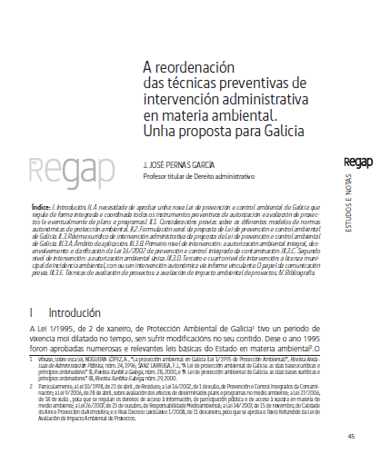 La reordenación de las técnicas preventivas de intervención administrativa en materia ambiental. Una propuesta para Galicia