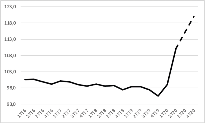 La previsión de caída del PIB, suponiendo que no haya un confinamiento generalizado a partir de septiembre de 2020, es superior a la que utilizamos, del 13 %7, mientras que el déficit se situaría en el 12,2 %8, esto es, no muy alejado de la previsión que utilizamos. No obstante, esos 4 puntos porcentuales adicionales de decrecimiento provocan que la estimación de la ratio deuda pública versus PIB se sitúe en el 120 % a final de año9. El nivel del que partíamos a inicio de año era del 95,5 % (véase gráfico 3). En el gráfico, se puede observar cómo de manera muy ligera e insuficiente10 la ratio iba disminuyendo. La parte discontinua de la serie identifica la extrapolación para los dos últimos trimestres del año basándose en el nivel estimado a final de año. Una cuestión importante, y que no por obvia se debe olvidar: en ausencia de la expansión fiscal a raíz de la COVID-19, el numerador de la ratio deuda/PIB no hubiese aumentado tanto en valor absoluto, pero el desplome de la actividad económica (denominador) hubiera caído todavía más de lo que ya lo ha hecho. A raíz de esta combinación de circunstancias alternativas, paradójicamente, habríamos llegado a una ratio similar a la que se estima que se llegará, pero con un coste social y afectación de nuestra capacidad productiva mucho mayor11.