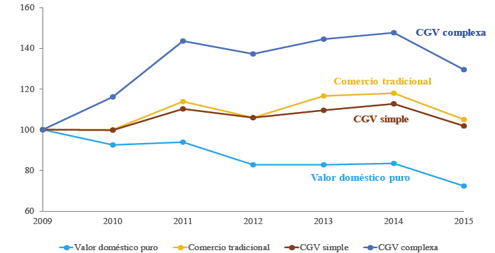 Por su parte, tanto las actividades generadoras de exportaciones de productos finales (comercio tradicional) como las actividades vinculadas con las CGV (simples o complejas) experimentan aumentos en su importancia relativa. Son precisamente estas últimas actividades, ligadas al fenómeno de la fragmentación productiva internacional, las que muestran un mayor salto entre 2009 y 2015, al pasar de representar el 8,5 % al 12,1 % del valor total generado en el conjunto de la economía (gráfico 1).