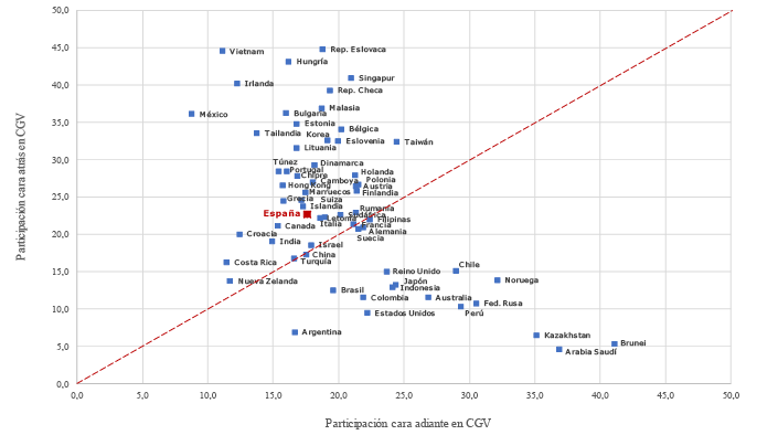 Desde una perspectiva comparada, se observa una gran heterogeneidad de modos de inserción, con situaciones en algunos casos muy diferentes. En este sentido, existe un amplio número de países que destacan por el mayor peso de los encadenamientos productivos hacia atrás, y por tanto con una elevada dependencia de la cadena de aprovisionamiento de insumos productivos, como es el caso por ejemplo de República Eslovaca, Vietnam, Hungría, Singapur o Irlanda, con más del ٤٠ % del valor exportado conteniendo valor generado en otras economías. En el otro lado, con un predominio de la participación hacia delante7, aportando valor generado internamente (doméstico) a las exportaciones de otros países, se encuentran, entre otros, países como Arabia Saudí, la Federación Rusa, Noruega o los Estados Unidos.
