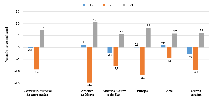 La primera manifestación de los efectos negativos de la COVID-19 a escala global fue el desplome experimentado por el comercio mundial, que sufrió una abrupta caída en el segundo trimestre del año 2020. En el caso concreto del comercio de mercancías, que representa más de 3/4 del comercio mundial, la caída intertrimestral fue del 14,3 %, aunque la mayor caída se produjo en el comercio de servicios, que descendió en un 30 % con respeto al primer trimestre del año. Se trata del mayor descenso intertrimestral del que se tiene constancia desde la anterior crisis financiera mundial de 2008-200915.