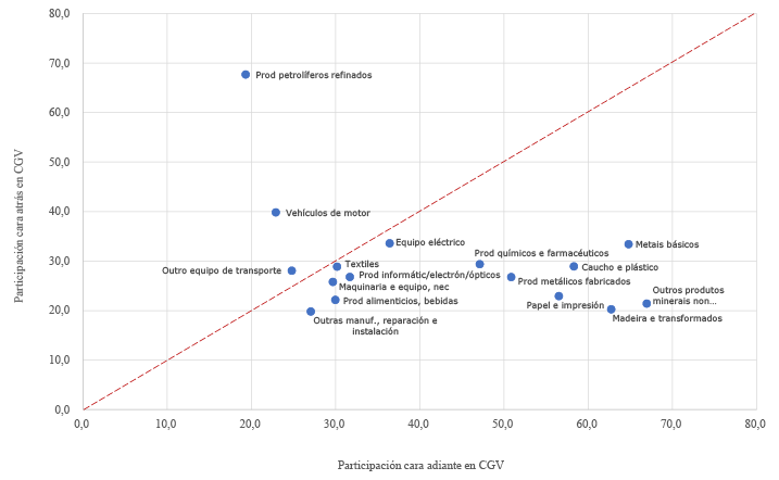 Otras industrias que muestran un importante peso de los encadenamientos productivos hacia delante son la industria química y farmacéutica (47,1 %), la industria de equipo eléctrico (36,4 %), así como los productos informáticos, electrónicos y ópticos (31,7 %). El resto de las actividades manufactureras (textil, alimentación y bebidas, maquinaria, material de transporte...) exhiben un peso de los encadenamientos hacia delante que se sitúan entre el 20 y el 30 % de sus respectivas exportaciones brutas.