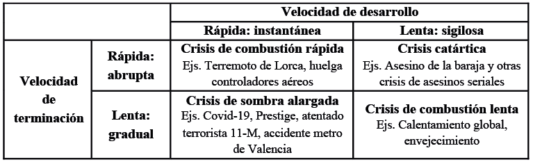 El tipo de crisis condiciona los aspectos comunicativos de la misma, según su trayectoria, aunque no hay análisis sobre el impacto de las distintas crisis sobre valoración y la confianza en los gobiernos. Las crisis de combustión rápida (Fast burning crisis), son abruptas, breves e intensas, y se producen como consecuencia de catástrofes y desastres naturales: seísmos, huracanes, maremotos, etc.11 El terremoto de Lorca en 2011 es un ejemplo característico de este tipo de crisis de combustión rápida, al igual que la nevada Filomena, en Madrid y otras Comunidades Autónomas, o las inundaciones de la DANA que asoló el Levante español en septiembre de 2019.12