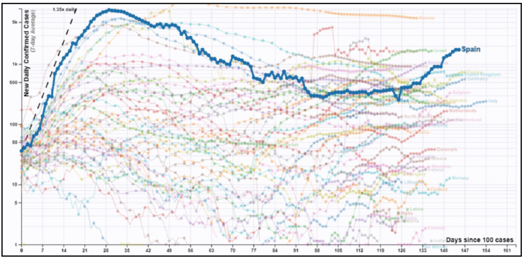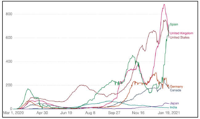 En crisis de sombra alargada, las trayectorias de las mismas pueden registrar variaciones por países, por regiones e, incluso, por ciudades, y los picos críticos en la fase de explosión pueden ser, incluso, tardíos, debido a la aparición de nuevas y más peligrosas cepas del virus, como se ha comprobado en 2021 en la India.