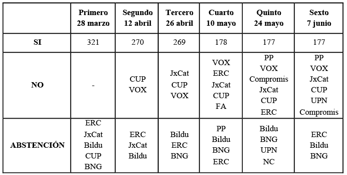Tabla 3. Apoyo en la votación sobre los decretos del estado de alarma en España, 2020