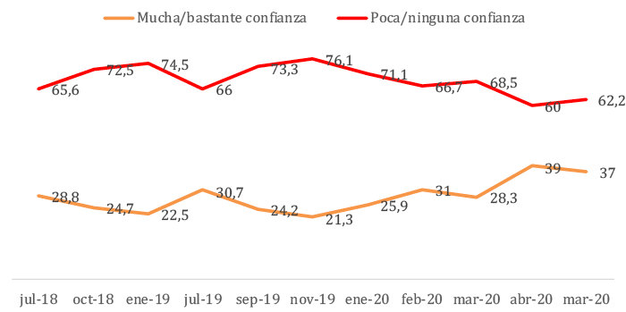En segundo lugar, el bajo techo de aprobación inicial del jefe del Ejecutivo podría ser otra de las causas, ya que un bajo techo de aprobación inicial hace difícil que sea sobrepasado, incluso, en presencia de una grave crisis nacional o internacional posterior. En Estados Unidos, se ha argumentado que una de las razones que ha impedido el efecto de cierre de filas en la crisis de la COVID-19 ha sido el bajo techo de aprobación de Trump, pues solo en los dos meses siguientes a su inauguración superó el 44 por ciento.35 Este bajo techo también pudo ser un límite para Sánchez, considerando que, durante 2018 y 2019, los niveles de poca o ninguna confianza hacia él y su Gobierno fueron muy altos, situándose entre el 65,6 % (julio 2018) y el 73,3 % (julio 2019). Si se compara con el primer ministro italiano, por ejemplo, Conte recibió en su momento inicial, incluso, un 62 por ciento de aprobación.